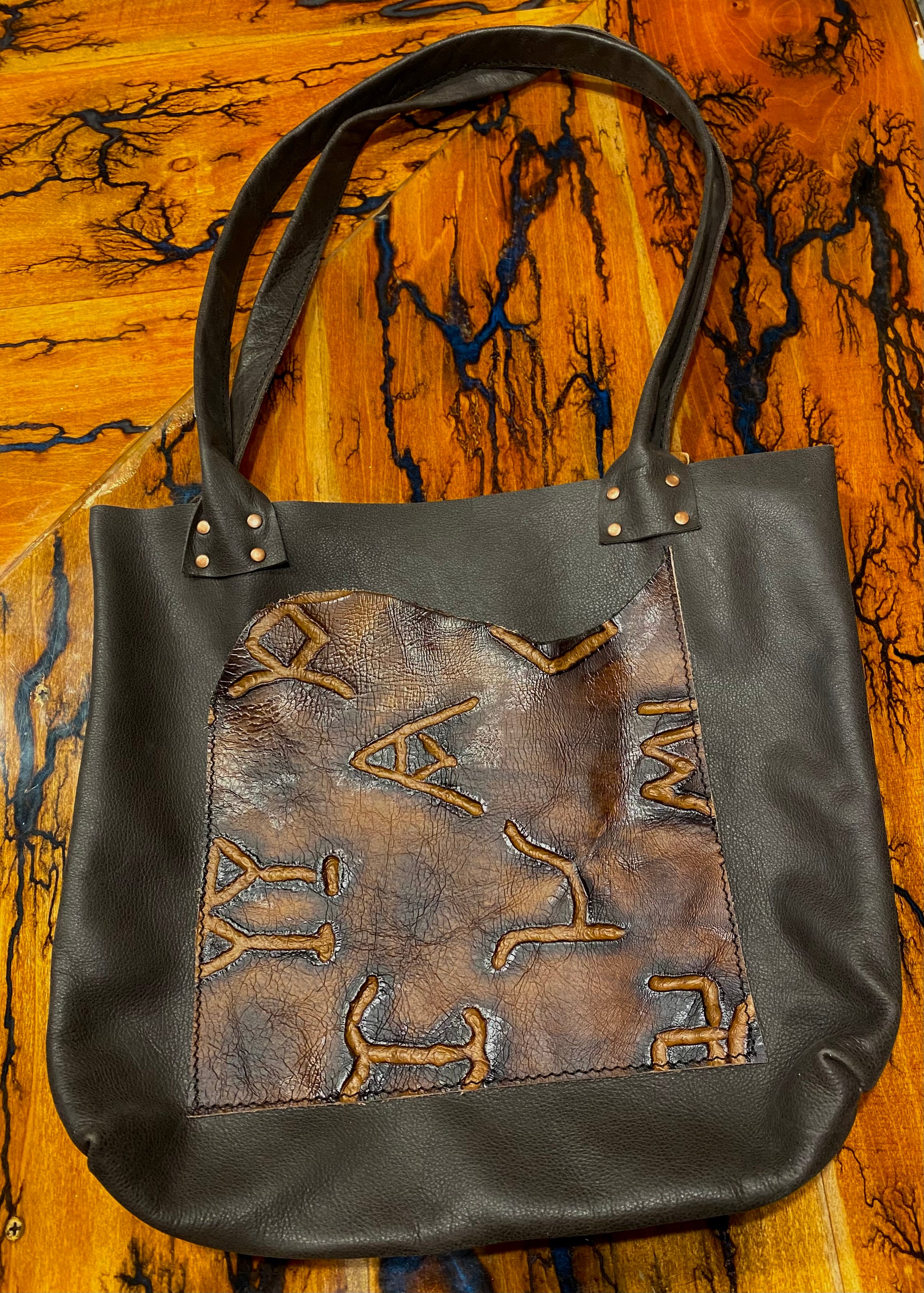 This is a handmade, one of a kind Leather Tote bag. Measures 14" wide x 13" tall Leather riveted handles Pockets inside and out. This from the “Cattle Queen” purse line. Purse has Cattle Queen Stamp, and is made in Texas.