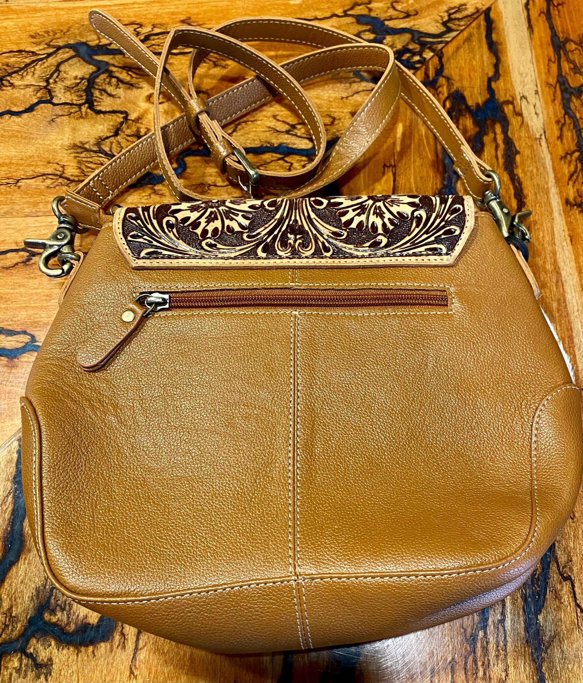 This is a handmade, one of a kind Leather bag. Measures 10" wide x 9" tall Cowhide on the front. Tooled leather panel, magnetic snap closure. Smooth brown leather on the back. 9". 1" adjustable strap This from the “CattleQueen" purse line. CattleQueen collection is made in Texas.