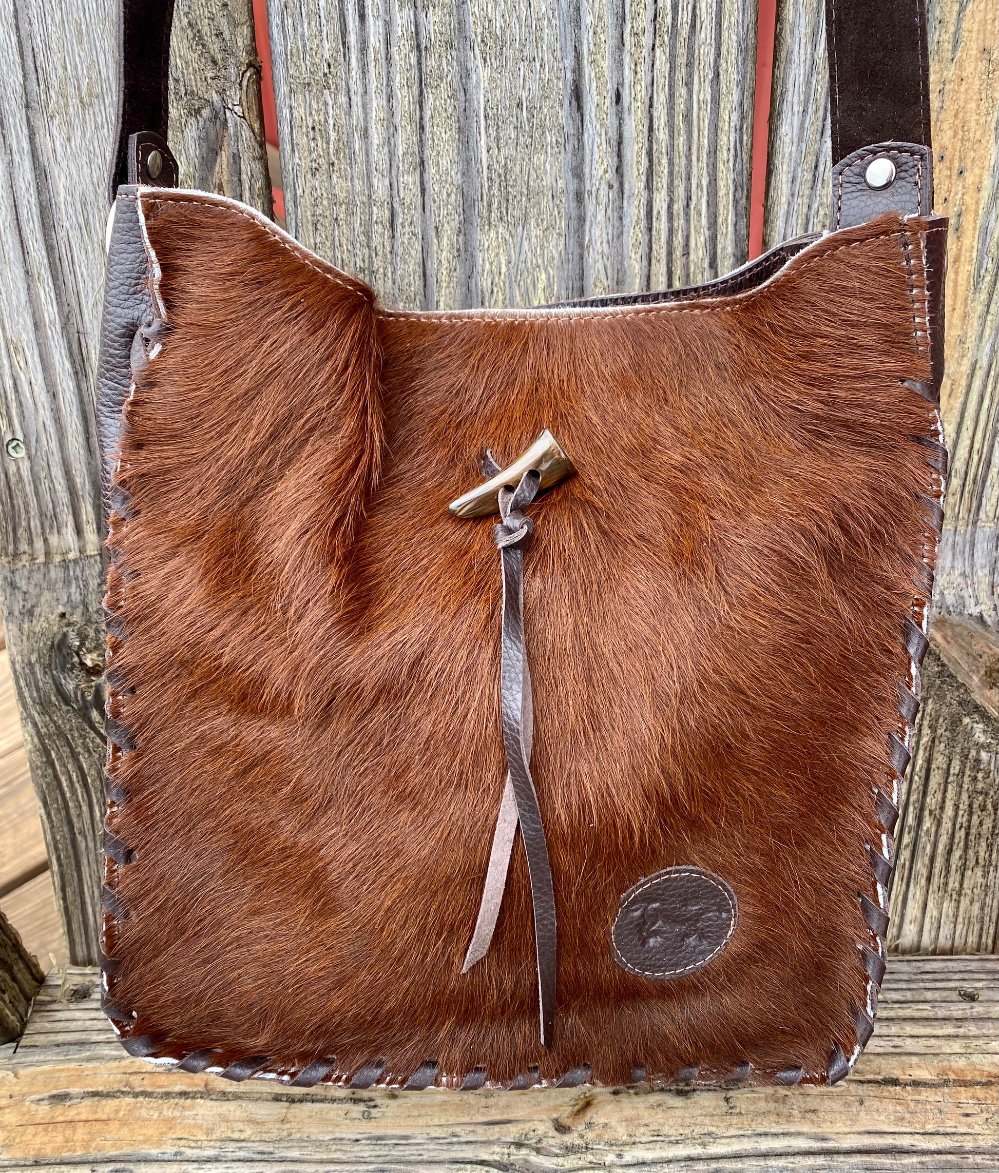 This is a handmade, one of a kind Leather bag. Measures 11" wide x 10" tall Cowhide on all sides. Magnetic snap closure. Key keeper and zipper pocket. Non-adjustable strap. CowTagsLeather features the CattleQueen collection is made in Texas.