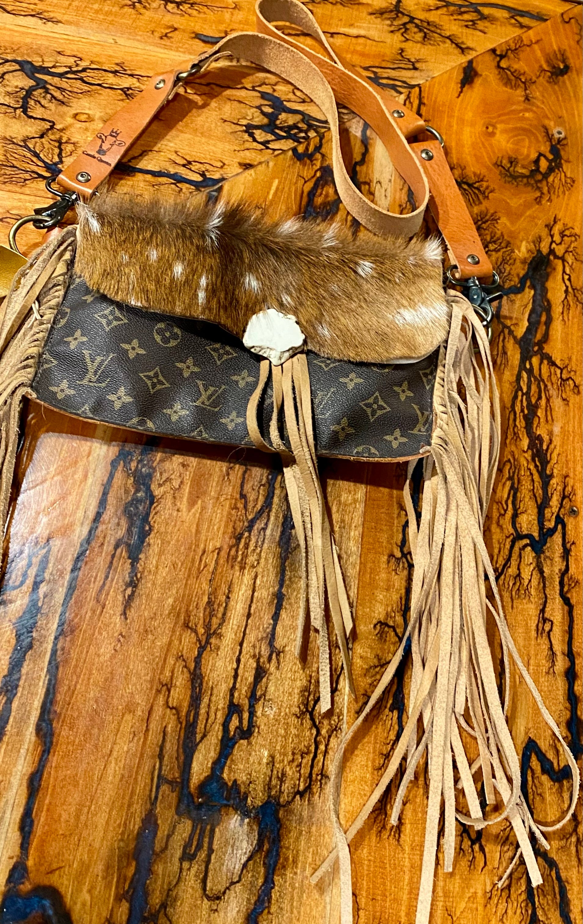 This is a one of a kind . LV material mixed with Axis Deer hide and Fringe. Purse measures 11" wide x 7" tall Fringe is 11" long. The center stone is White Howlite. (The stone of patience and perspective) 1" strap is attached. This purse is from the “Cattle Queen” line. Brand in purse, Made in Texas.
