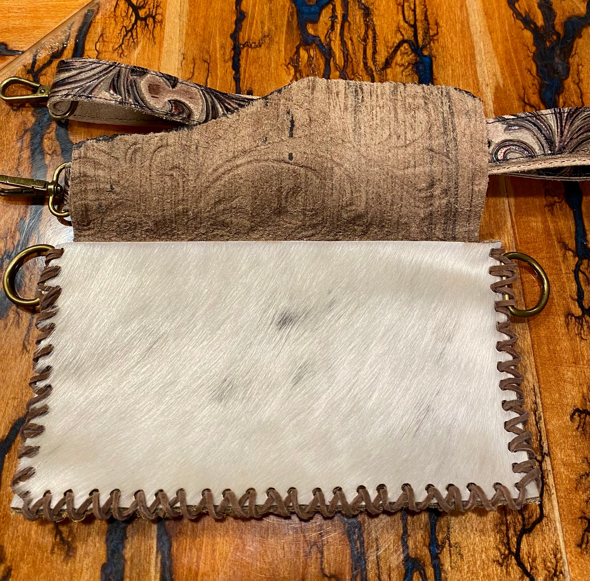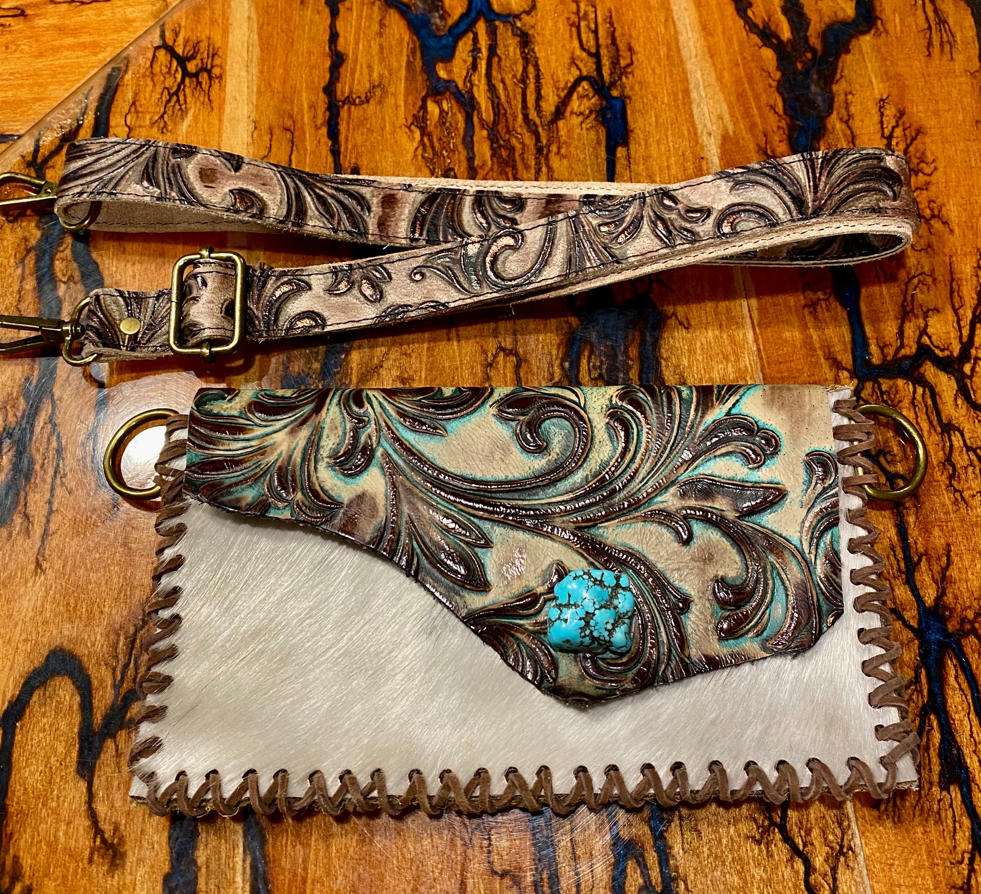 This is a one of a kind . Raw edge Cowhide and Embossed Leather. Stone is natural Turquoise. Purse measures 9" wide x 5" tall. 1" strap is attached. This purse is from the “Cattle Queen” line. Brand in purse, Made in Texas.